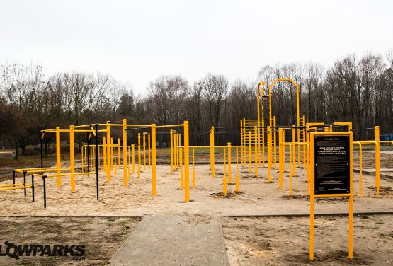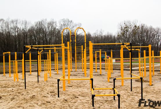 Najważniejszym elementem jest zdublowany ciąg urządzeń złożonych z drążków, poręczy równoległych oraz 4,5-metrowej drabinki poziomej. Ciągi te są symetryczne względem skośnej osi. Unikatowe są 3-metrowej wysokości drabinki pionowe połączone ramą służącą do zawieszania kółek gimnastycznych i lin na wysokości 5,6 m ponad poziom nawierzchni.