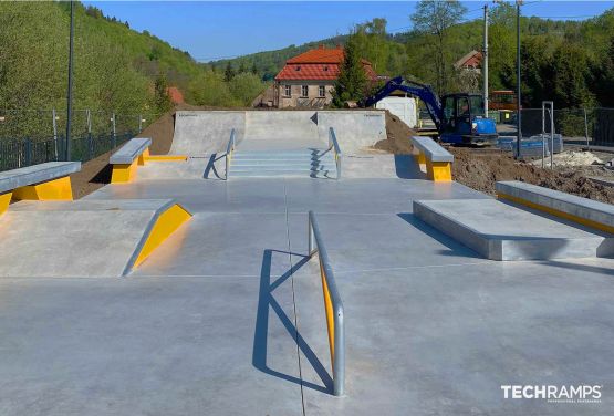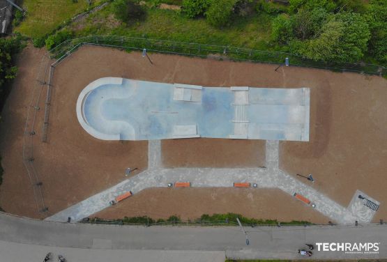 Skatepark o klasycznej formie prostokąta, zaprojektowany w formie SLS. Posiada platformę streetową oraz otwartego bowla -> idealny dla początkujących i zaawansowanych użytkowników.